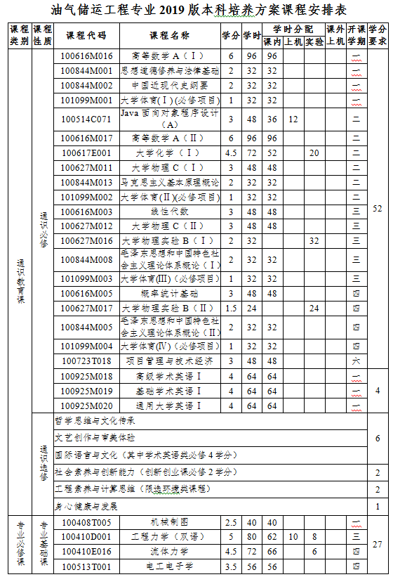 工程力学(双语)、流体力学、泵与压缩机、工程热力学与传热学(双语)、油气储运仪表与过程控制、城市燃气输配、输油管道设计与管理、油气储存与装卸、管道与储罐强度、油气集输(双语)、输气管道设计与管理、油气储运系统自动化与智能化、油气储运设施安全与完整性管理等。