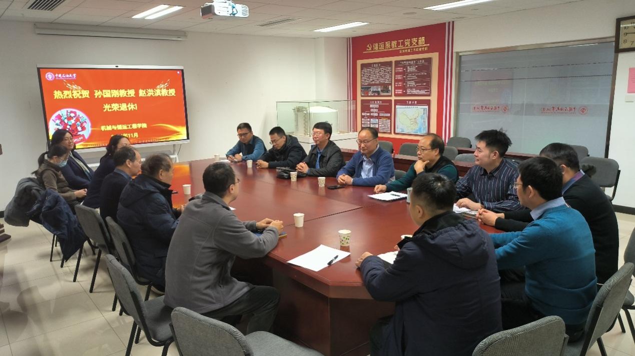11月27日上午,机械与储运工程学院在主楼B921会议室举办2024年下半年荣休座谈会,庆祝孙国刚教授和赵洪滨教授光荣退休。机械学院院长李振林,党委书记王玮,副院长左丽丽,过程系、能动系部分教师代表参加了本次座谈会,会议由工会主席彭鹤主持。