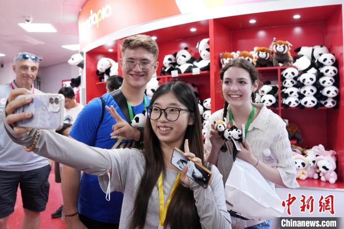 6月26日,参加中国石油大学(北京)夏令营的美国高校师生参观北京动物园。图为中美青年与熊猫文创自拍。张祥毅 摄