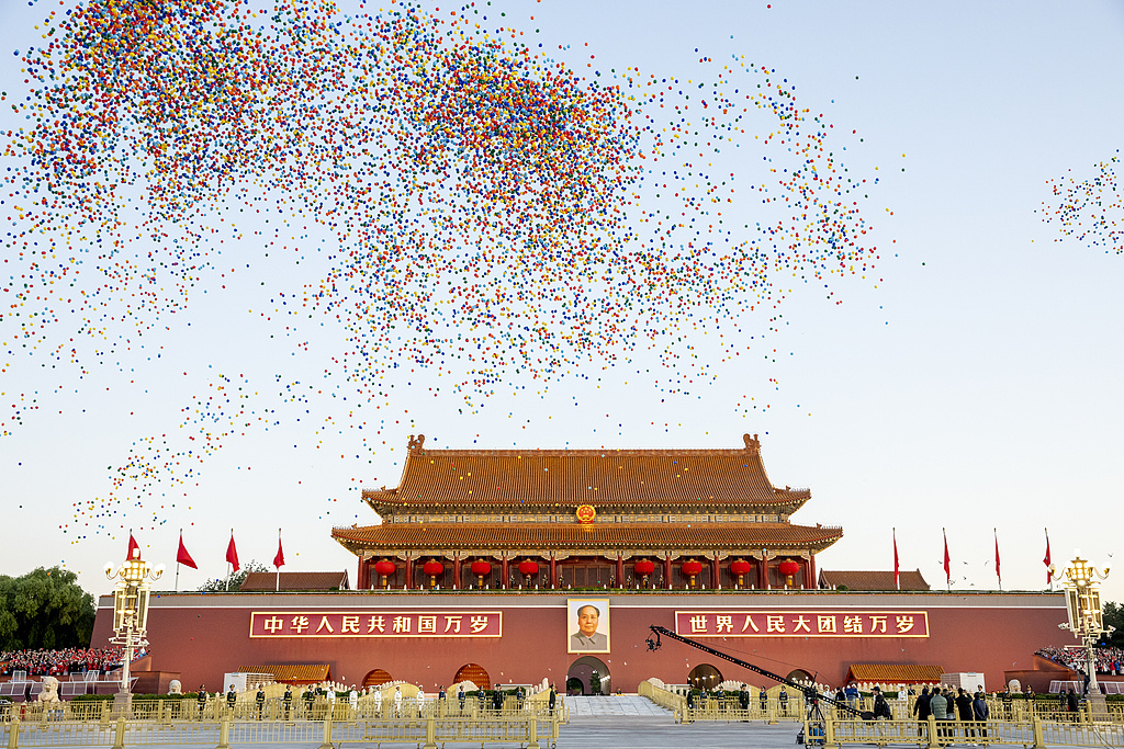 万千气球与白鸽飞过天安门城楼