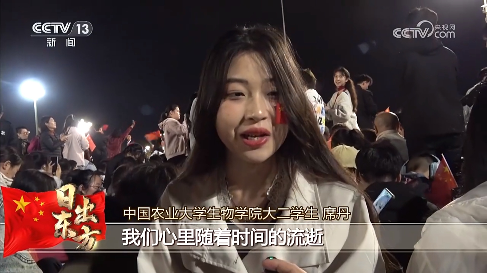 中国农业大学生物学院大二学生 席丹:我们周边还有很多人陪我们,很多志同道合的人,我们心里随着时间的流逝会越来越兴奋。国旗升起的那一刻,想大声地祝我们新中国75周岁,生日快乐。