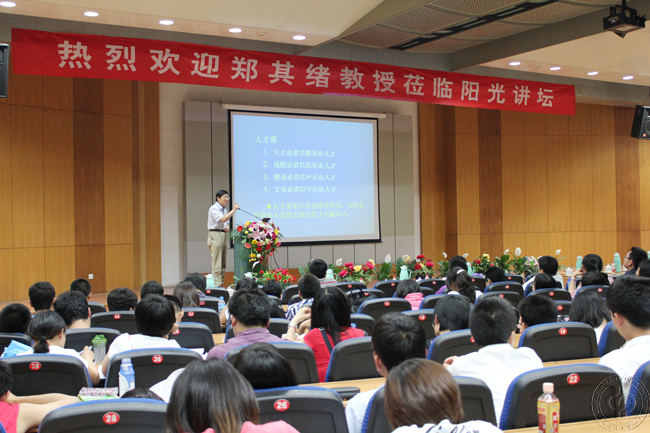 郑教授从“应该树立怎样的人才观”、“人自身在成才中的作用”、“要在平凡中追求非凡”以及“要做抓住机遇的有心人”等方面展开演讲,并结合自身经历,真实而生动地为大家展示了一个大学生成功做到社会成才的全过程。他认为,机遇是成才的必要条件,大学生应该积极关注社会、关注发展,要善于在竞争中发掘契机,从而塑造成功的人生。同时,大学生在学习专业知识的过程中也不能忘记要努力做到全面发展。当今社会最需要的是全面发展、具有良好综合素养的人才,只有全面提高自身素质,大学生在毕业后才能成就更好的未来。郑教授还强调,谦虚是一种无形的武器,谦虚可以使大学生更注重完善自己,并且有助于在今后的工作中形成良好的社会关系。讲座最后郑教授表达了对同学们良好的祝愿。