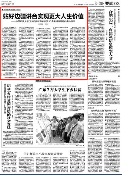 继5月15日《中国教育报》以《共绘新时代教育援疆画卷》为题报道了16所教育部直属高校的30多名教师来到中国石油大学(北京)克拉玛依校区,对口支援校区建设的事迹后,7月11日,《中国教育报》再次以《站好边疆讲台实现更大人生价值》为题报道了中国石油大学(北京)克拉玛依校区30多名援建教师的奋斗故事,教育部官网新闻专栏“聚焦教育援疆系列报道”也作了发布。
