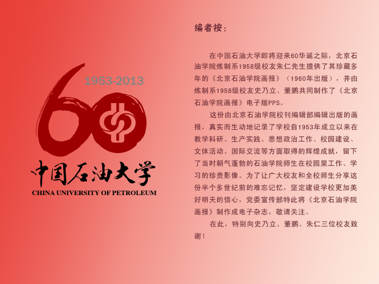 在中国石油大学即将迎来60华诞之际,北京石油学院炼制系1958级校友朱仁先生提供了其珍藏多年的《北京石油学院画报》(1960年出版),并由炼制系1958级校友史乃立、董鹏共同制作了《北京石油学院画报》电子版PPS。为让广大校友和全校师生分享这份半个多世纪前的难忘记忆,坚定建设学校更加美好明天的信心,党委宣传部特此将《北京石油学院画报》制作成电子杂志,敬请关注。