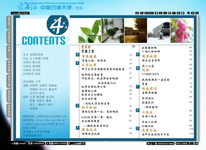 第四期《爱石油》会带你拥有一次五彩纷呈的旅程——踏入“本科学术男”的世界;解剖大学爱情;分享过来人求职经验;晒晒花哨的宿舍小窝;知晓徐克、杰伦干点啥;搜罗温馨小店;发现喜欢的书……
