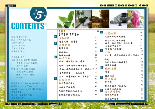 读本期的《爱石油》,你会发觉励志的风云人物就在我们身边,朝气蓬勃的校园在发生着什么?在寻找一个理由让你踏上异国?又或者想了解交换生们的酸甜苦涩?无论你怀有怎样的初衷接触到它,相信带给你的视觉与心灵的冲击定会让你无悔这次尝试。
