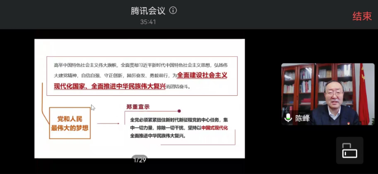 陈峰在宣讲中指出,党的二十大是在全党全国各族人民迈上全面建设社会主义现代化国家新征程、向第二个百年奋斗目标进军的关键时刻召开的一次十分重要的大会,事关党和国家事业继往开来,事关中国特色社会主义前途命运,事关中华民族伟大复兴。深入学习宣传贯彻党的二十大精神,对于激励广大党员干部和师生员工更加紧密地团结在以习近平同志为核心的党中央周围,落实立德树人根本任务,全面对接国家科教兴国战略、人才强国战略、创新驱动发展战略,加快建设能源领域特色鲜明的世界一流研究型大学,保障国家能源安全、推动能源绿色发展,为全面建设社会主义现代化国家、全面推进中华民族伟大复兴作出新的贡献,具有重大现实意义和深远历史意义。