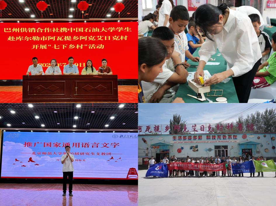 “今天大哥哥、大姐姐们给我们上课,我学到了很多科学知识。希望以后他们还能来。”7月9日,实践团联合北京师范大学研究生支教团,在库尔勒市阿瓦提乡阿克艾日克村开展“七下乡村”活动,通过开设国家语言文字推广、地质科普宣讲、科学趣味实验、素质拓展活动等多样化的课程,丰富了当地少数民族学生的生活,加大了国家通用语言文字在边疆少数民族地区的推广力度。