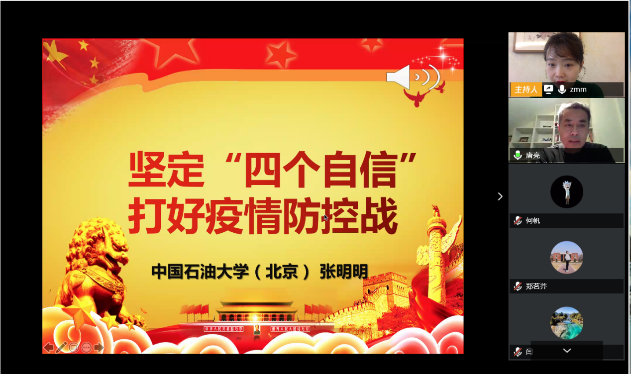 在当前疫情形势下,为进一步增强“四个意识”,坚定“四个自信”,抓紧抓实抓细疫情防控工作,4月16日上午,中石大体育与人文艺术学院直属党支部开展组织生活,马克思主义学院青年教师张明明应邀上了题为“坚定‘四个自信’,打好疫情防控战”的主题党课。