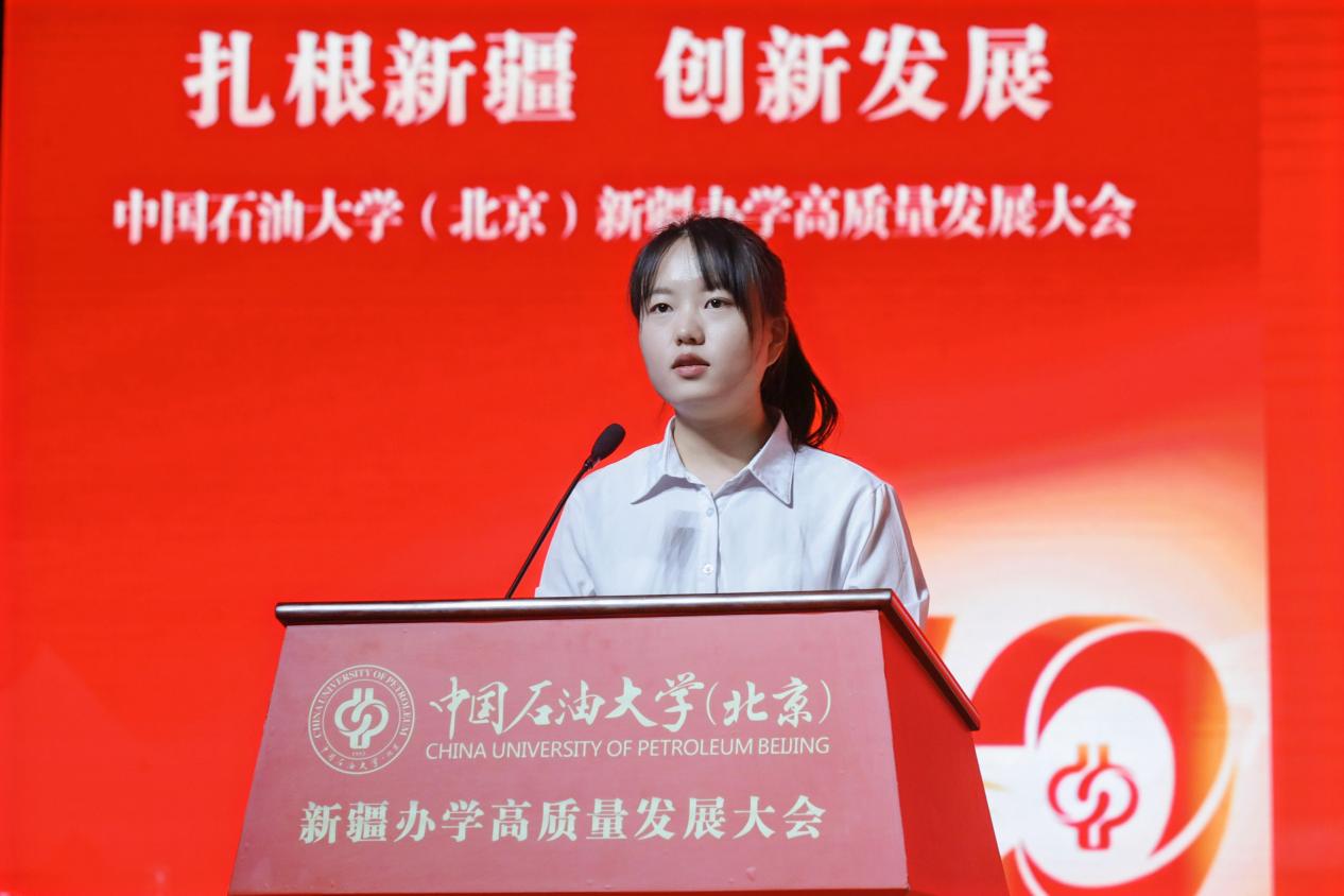 留疆毕业生代表、克拉玛依校区2020届毕业生阮思雅分享了自己扎根新疆油田一线的成长历程,表示将不负母校厚植于心的家国情怀,在建设美丽新疆的征程中书写新时代中石大人的精彩篇章。