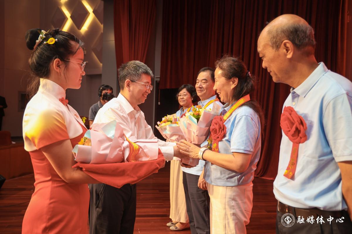 国家级教学名师朱筱敏作为荣休教师代表发言,他回顾了四十余载从教历程,从敬畏三尺讲台、追踪学科前沿、精细设计课程和倡导研讨教学四个方面谈了对如何做好一名大学教师、讲好一门课的认识,在发言中细数育人点滴,殷切寄语青年教师以满腔热忱助力学生成长。
