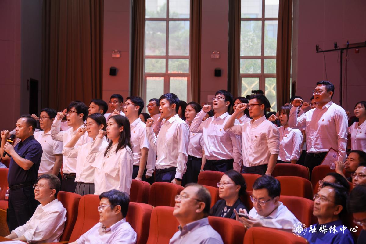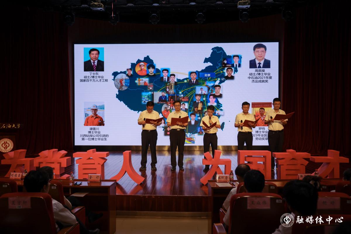 今年,学校迎来了60余名新进教职工,他们为学校教师队伍注入了新鲜血液。在人事处常务副处长、党委教师工作部部长、人才办主任姜福杰的领誓下,新入职教职工进行了庄严的入职宣誓,郑重承诺将履行教师神圣职责,严格遵守《教师职业道德规范》,为建成能源领域特色鲜明的世界一流研究型大学而努力奋斗。8名新教师代表郑重接过老教师手中的接力棒——微缩版“石大魂”,它源自学校图书馆正北侧的雕塑,红烛、火焰、地球等设计元素寓意中石大事业发展在代际传承中蒸蒸日上。