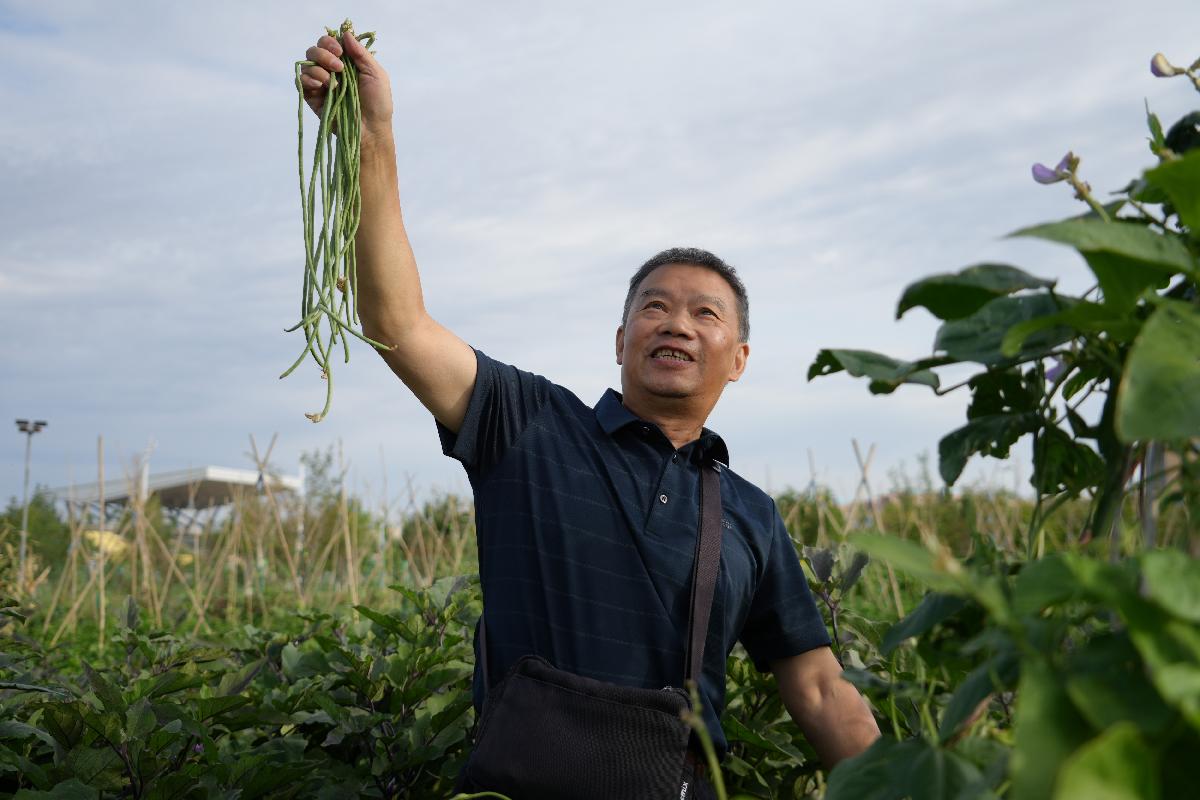 图为银龄教师在克拉玛依校区试验田上采摘果蔬
