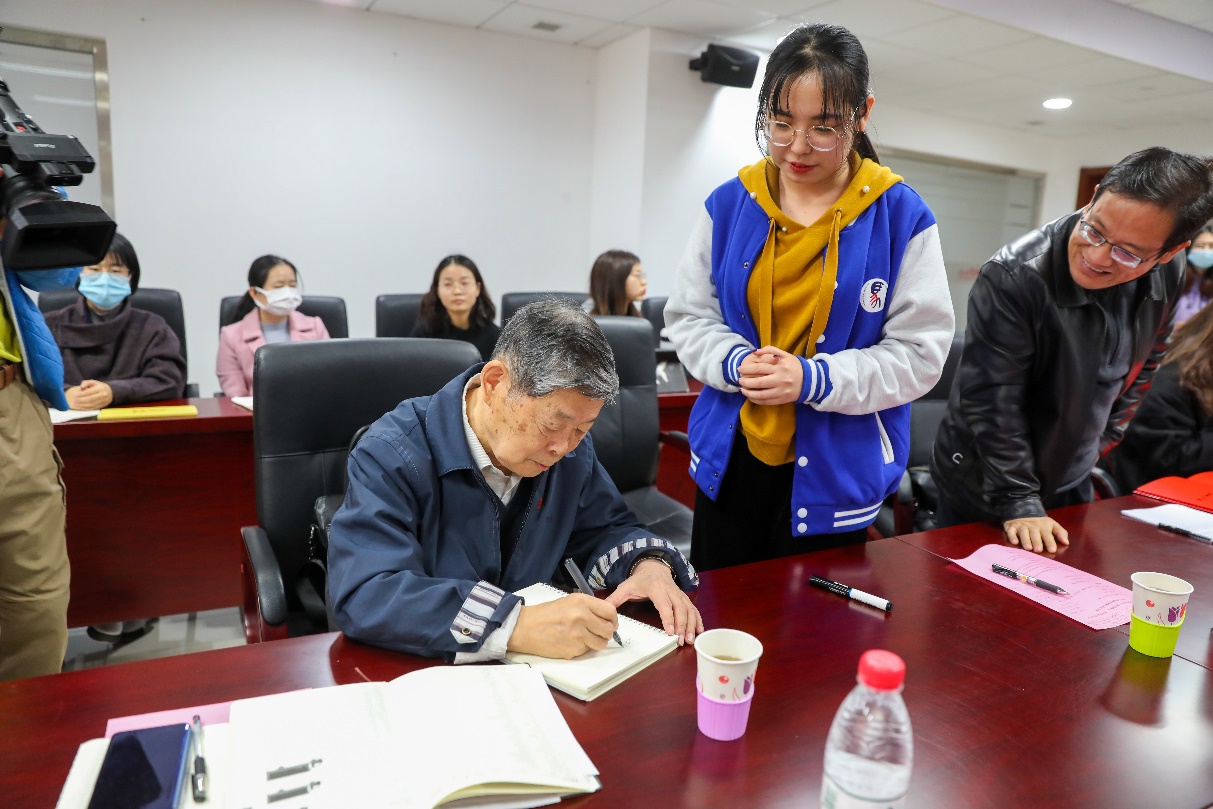 启民校友本次的中石大行,因为年事已高和身体原因,得以成行已经相当不容易。但出乎所有人意料的是,老人家到了校园里,不顾旅途疲乏,48小时内行程满满。第一站,他就参观了“学习回信精神,勇担时代使命”主题展览。在参观过程中,他被路过的马克思主义学院曹培强教授认了出来。曹教授热情地与启民校友交流,他惊喜地发现,眼前这位老人不仅是一位科研狂人,在政治理论方面还有极高的素养,对很多问题有着相当深刻且独到的见解。他感慨道:自己作为思政课老师,常常给同学们讲铁人精神,但直到今天才终于有机会见到“新时期铁人”并当面交流和学习,实在是太激动了。这次偶遇,让曹教授深感幸运,他征得启民校友的同意后,将他们的谈话录音并与启民校友合影,为以后的思政课保留下珍贵的影像资料。但同时,因为启民校友在中石大的行程安排很紧凑,马克思主义学院的其他老师可能就无缘与启民校友当面交流,曹教授为此倍感遗憾。启民校友得知后,不辞辛苦,特意将临动身去机场前的一个小时时间挤出来,与马克思主义学院的青年师生进行交流座谈,回答了马克思主义学院师生的提问,为马克思主义学院题词,为学生签名,并与大家合影留念。启民校友在校的第一站和最后一站都和马克思主义学院有关,所有互动问答都是在马克思主义学院,不能不说是启民校友和马克思主义学院的特殊缘分,这也让马克思主义学院的老师同学们惊喜和获益匪浅!