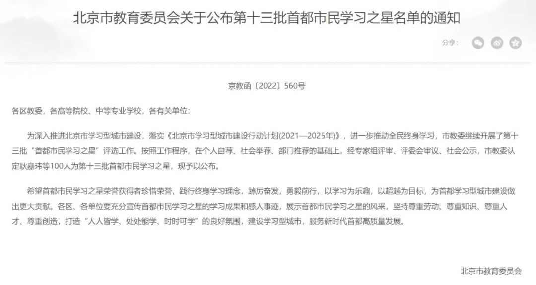 近日,北京市教育委员会公布了第十三批首都市民学习之星名单,中石大张仕民教授入选,目前学校已有9名师生获评。