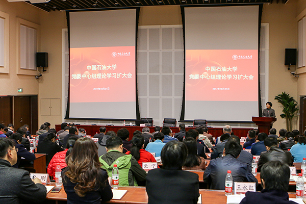 10月31日下午,中国石油大学在主楼C308会议室召开党委中心组理论学习扩大会,深入学习领会党的十九大精神,传达中央、教育部和北京市学习宣传贯彻党的十九大精神的相关要求,对学校迅速兴起学习宣传贯彻热潮进行工作部署。