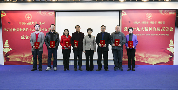 “作为宣讲团的一名成员,我深感使命光荣。我一定和同事们一道努力学透十九大精神,认真备课,在宣讲中把十九大精神和习近平新时代中国特色社会主义思想讲清楚、讲到位,不辜负党中央对理论工作者的期待,不辜负校党委对我们的信任和要求!”11月9日下午,中国石油大学在学生活动中心410报告厅举行仪式,正式成立学习宣传贯彻党的十九大精神宣讲团。马克思主义学院教师吴建伟代表宣讲团10名教师发言,表达了全力以赴宣讲好十九大精神的信心和决心。包括吴建伟在内的此次受聘的10名宣讲团成员,均为马克思主义学院思想政治理论课骨干教师,他们不仅随后将深入各单位、各学院开展广泛宣讲,还将在第一时间让党的十九大精神走进课堂,走进学生头脑。