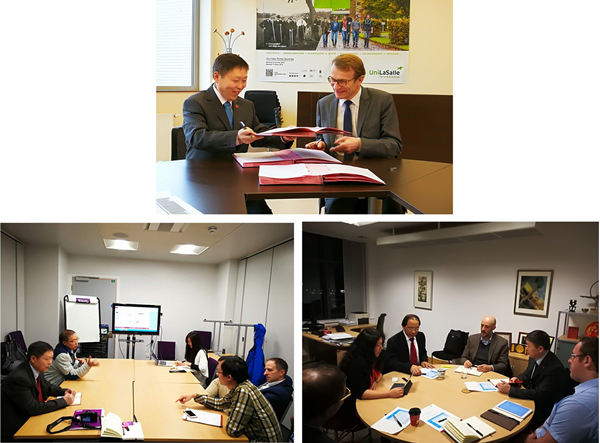 访问期间,代表团一行分别与法国拉萨尔大学校长菲利普·肖凯、英国曼切斯特大学校副校长Stephen Flint、英国利兹大学副校长余海岁及三校相关学院教师代表进行座谈交流,在加强校际合作关系、联合培养学生、短期学生交流、教师互访、科研合作交流等方面达成合作一致,分别签署合作协议或合作备忘录,并就下一步工作开展制定实施计划。