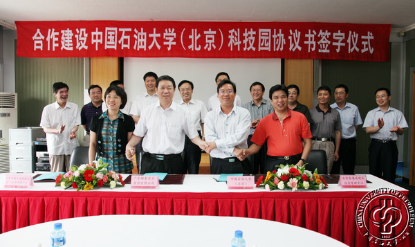 6月18日上午,广东榕泰实业股份有限公司、北京金惠友创业投资管理中心、北京市昌平区科技交流与合作促进中心与中国石油大学合作建设中国石油大学(北京)科技园协议书签字仪式在石大翠宫第五会议室举行。教育部贾一伟处长、昌平区副区长方炎、北京市校办产业管理中心主任翟士良、北京市科委主管工程师龙华东以及昌平区科委、财政局、招商局、中关村科技园区昌平园管委会和三家共建企业的有关领导,校长张来斌,副校长徐春明,以及学校相关职能部门、学院和校产总公司的负责人共40多人参加了签字仪式。签字仪式由徐春明主持。