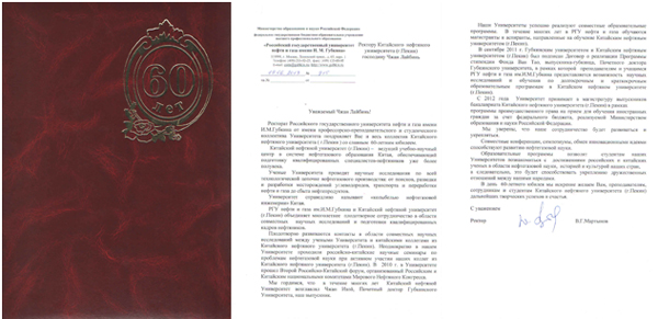 我校的学者和来自中国石油大学的同行们在联合科研领域的交流愈发密切。在我们学校不止一次地举行了关于石油科学问题的中俄科学研讨会,来自中国石油大学的同行们都积极地参与了研讨会。2010年,由世界石油大会俄罗斯和中国全国委员会举办的第二届中俄论坛在我校举行。