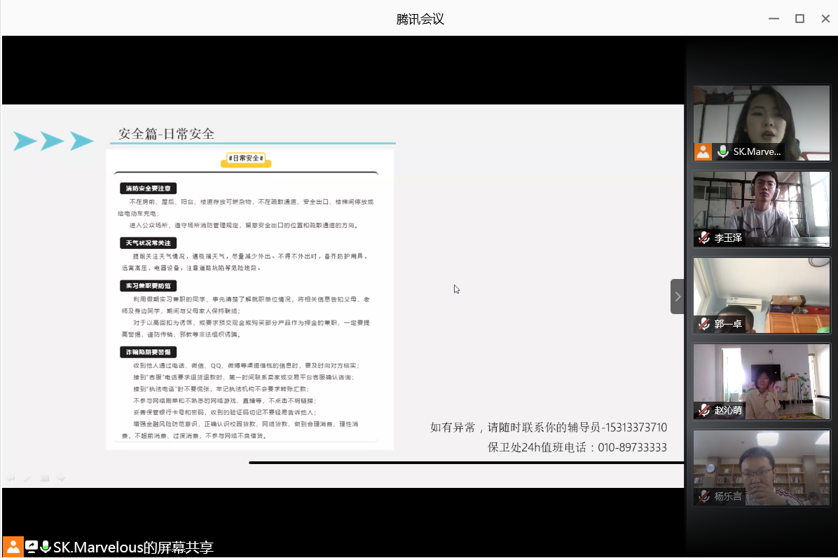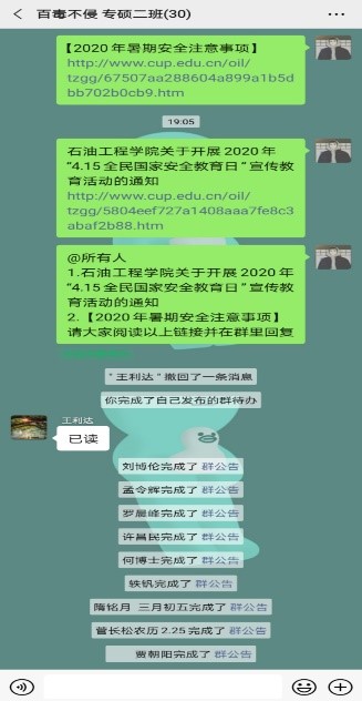 近日,石工学院各级辅导员通过网络平台视频会议形式,分层、分类、分级地召开了年级大会、专业大会、班级骨干工作会。按照学院统一部署,各级会议重点做了疫情期间的个人安全、实验室安全、假期安全、宿舍安全、网络安全、财产安全等;在7月8日下午,学院同时也召开了在校学生集中安全教育。会上,辅导员就校园安全问题进行了专题教育,重点讲解了实验室、宿舍、实习、假期安全注意事项,提醒同学们加强安全防范意识,严格遵守学校的安全管理规定,携手共创平安校园。