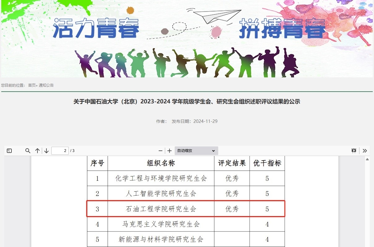 在共青团中国石油大学(北京)委员会组织的2023-2024学年院级学生会组织述职评议工作中,经材料评审和现场答辩,石油工程学院研究生会以第3名获评优秀,连续三年在学校院级研究生会组织述职评议中获评优秀。