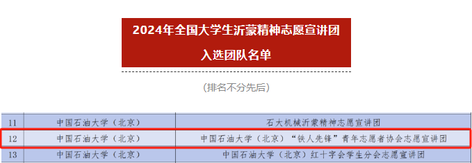 近日,由团中央青年志愿者行动指导中心、共青团山东省委、中共临沂市委联合举办的2024年全国大学生沂蒙精神志愿宣讲团入选名单发布。学院“铁人先锋”青年志愿者协会入选。