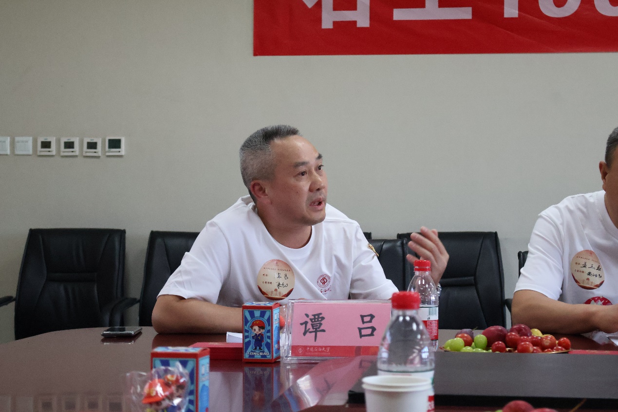 黄世军、刘伟、刘东东、曹仁义向校友表示欢迎,为每一位校友送上学院专属“桶宝”手办、立牌、钥匙扣等纪念品,并表示将凝聚校友资源、经验及力量,同心助力学校学院未来事业发展和学科进步。