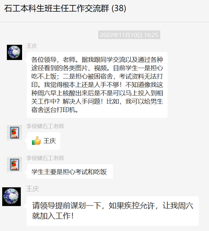 油气田开发系王建国老师主动报名,作为温德姆酒店隔离点带队老师,陪同学一起隔离。安维青、周晓峰两位老师入驻润杰公寓,门成全老师入驻东校园,协助解决学生们关切的问题。得知班里一名同学身体不适,需要复诊,石工21-3班班主任赵晓亮老师立即赶去医院,帮助学生远程就医复诊。