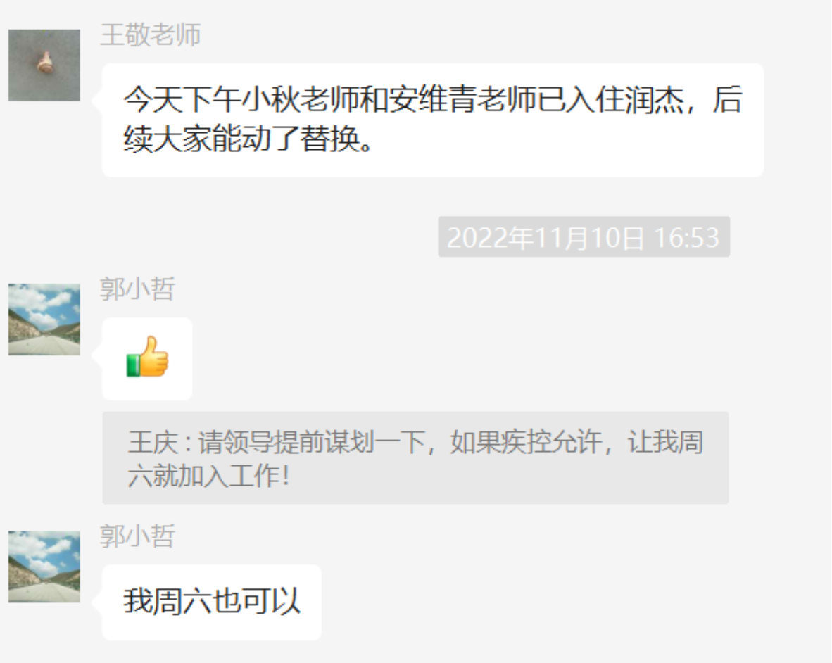 学生在哪里,老师就在哪里。宋执武老师进驻东校园参与服务保障工作。王小秋老师“丢”下“小家”中1岁多的小孩,义无反顾进驻润杰公寓这个“大家”,陪伴守护本科生。协调运来1台打印机,解决学生无法打印的难题。一位本科生突发腹痛尿结石,王老师克服困难第一时间将学生送到医院治疗,主动陪护、嘘寒问暖,用心守护、用爱陪伴。