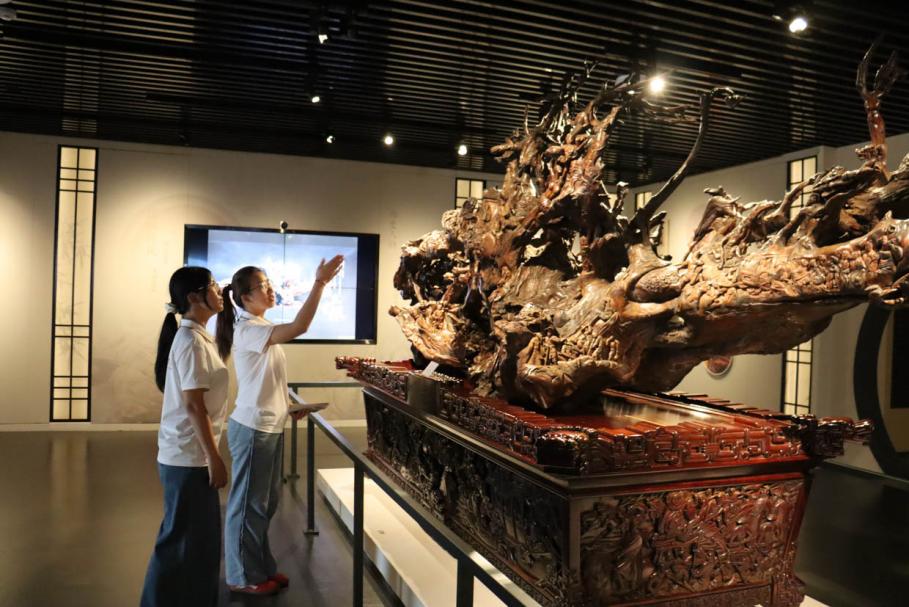 图为实践团成员参观学习汉寿木雕