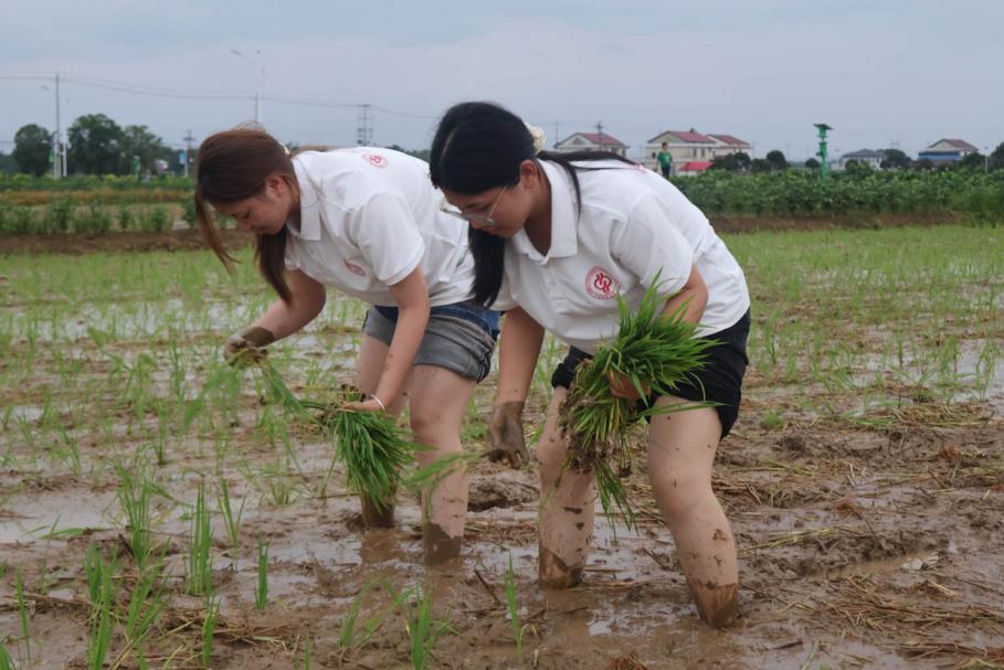 图为实践团成员参与港中坪村双季稻插秧活动
