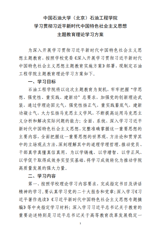 学习贯彻习近平新时代中国特色社会主义思想主题教育全面启动以来,中石大石油工程学院把开展好主题教育作为重要政治任务,牢牢把握“学思想、强党性、重实践、建新功”总要求,把扎实开展主题教育作为坚定拥护“两个确立”、坚决做到“两个维护”的实际行动,将理论学习、调查研究、检视整改、推动发展等融合贯通,实施了“两案四单”工程,高质量推进主题教育走深走实。