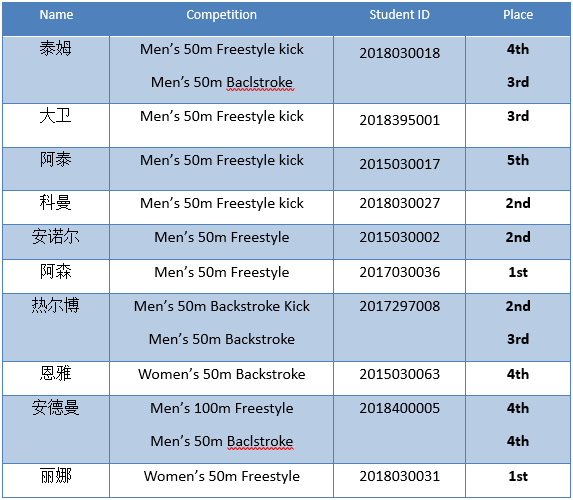On November 17, 2018, the university swimming competition kicked off at China University of Petroleum (Beijing). First of all, we want to announce the great results and hard work of our college: three champions, three second placers, three third placers, and four fourth-placers. We ranked fourth position among all participating teams. Let us appreciate their tram together.
