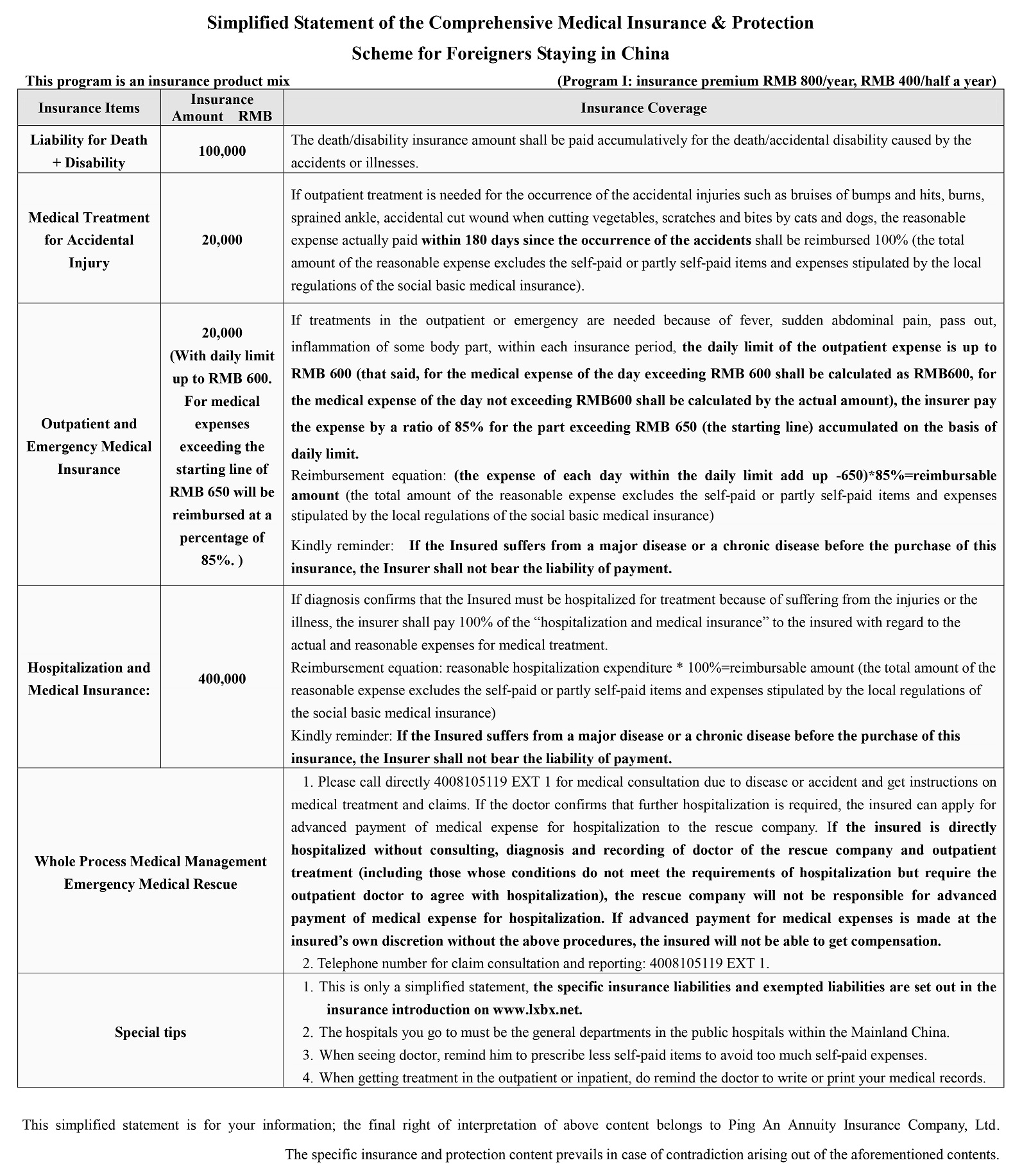 According to the regulations, all of the international students in China must buy personal insurance. The insurance company will cover the expenses occurred in your medical or accident treatment. You can find the details in the insurance instructions handbook.