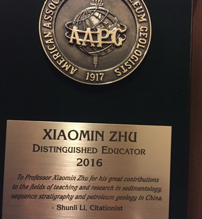 在加拿大卡尔加里2016年6月19日举行的AAPG年会开幕式和颁奖仪式上,AAPG在全球范围内共评选出2016年度1位最高奖-Sidney奖(美国Paul Potter教授)、1位Halbouty杰出领导者奖(美国Scott Tinker)、评选出2位Murray杰出教育家奖(Grover E. Murray Memorial Distinguished Educator award)(美国和中国各1位)等奖项。中国石油大学(北京)地球科学学院朱筱敏教授因在沉积地质学、层序地层学以及石油地质学领域教学科研中取得的成绩获得了该国际奖。AAPG主席JohnR.Hogg亲自颁奖并合影留念。Murray(前AAPG主席、美国德州理工大学校长)杰出教育家奖设立于1993年,每年在全球与地质、石油地质相关的高校评选地质教授1-4人。朱筱敏是亚太地区第一位获得该奖的地质教授,为扩大中国石油大学(北京)的国际影响、推进国际交流起到了积极作用。