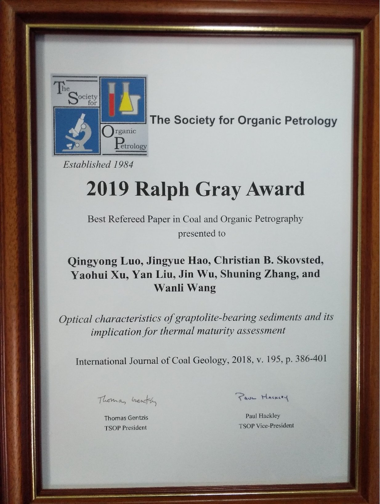 Ralph Gray奖是为纪念著名的美国煤岩学家Ralph Gray而设立的,用以表彰在煤和有机岩石学领域做出重要贡献的科学家,该奖项每年在全世界范围内只授予一项研究成果。罗情勇副教授因对古老海相烃源岩中笔石表皮体的有机岩石学特征的研究获得该奖,获奖成果为“Optical characteristics of graptolite-bearing sediments and its implication for thermal maturity assessment”(该成果2018年发表在国际能源地质领域著名期刊International Journal of Coal Geology, 195卷, 386-401页),这也是中国大陆研究人员首次获得该奖项。