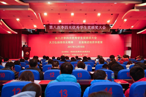 12月18日下午,第八次李四光优秀学生奖颁奖大会在中国矿业大学(北京)举行。出席颁奖大会的嘉宾有国务院参事、国土资源部原总工程师、李四光地质科学奖基金会理事长张洪涛、原国土资源部科技与国际合作司司长姜建军、原李四光地质科学奖委员会秘书长王泽九、教育部科学技术司司长雷朝滋、中国地质调查局原党组成员、中国地质科学院原党委书记、副院长、李四光地质科学奖委员会秘书长王小烈、中国工程院能源与矿业学部主任彭苏萍院士、中国矿业大学(北京)校长杨仁树、中国地质大学(北京)副校长刘大锰、中国石油大学(北京)副书记、副校长韩尚峰、北京大学教务部副部长刘建波、北京大学地球与空间科学学院名誉院长潘懋等。24位获奖学生和900多名地质专业学生代表参加了颁奖大会。大会由中国矿业大学(北京)党委副书记王忠强主持。