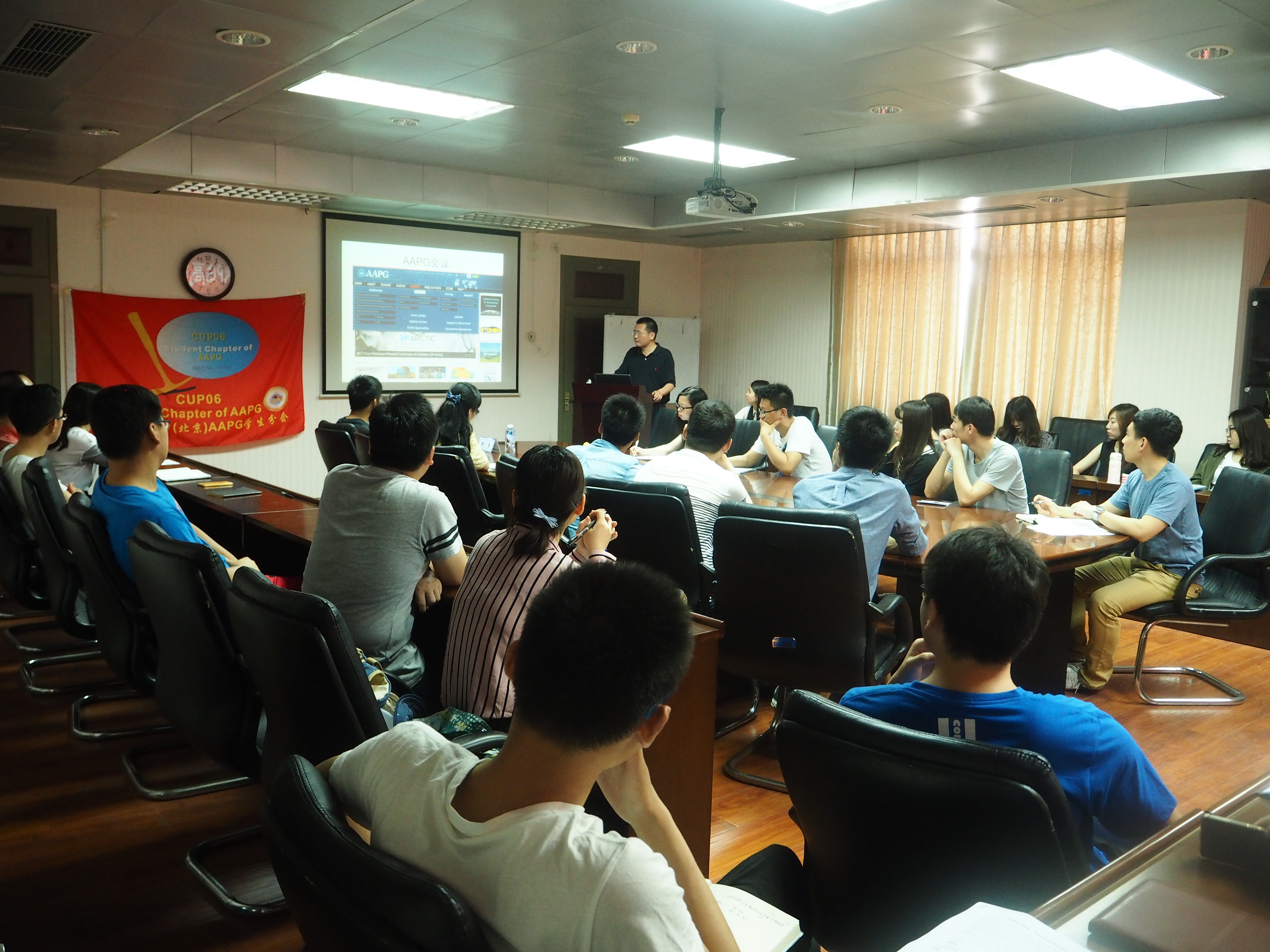 5月19日下午于学生活动中心410举办的学术讲座邀请到了中国石油大学(北京)地球科学学院纪友亮教授、中国石油勘探开发研究院杭州地质研究院副院长姚根顺教授、中国石油勘探开发研究院油气开发战略研究所科技战略规划室主任窦宏恩老师三位主讲嘉宾,从AAPG百年大会热点、最新地质研究成果和科技论文写作等方面与各大高校师生进行交流。中国石油大学(北京)地球科学学院金振奎教授也受邀出席交流会。