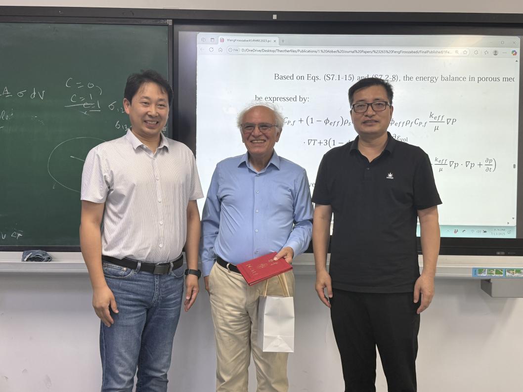 课程尾声迎来历史性时刻,石油工程学院宋先知院长和人事处刘悦副处长代表学校向Firoozabadi教授颁发了荣誉教授聘书,标志着校方与国际顶尖学者的深度合作正式启动。宋院长致辞说:“您三天来的倾囊相授,展现了热力学在能源领域的永恒价值。”刘处长也强调:“这份聘书不仅是仪式象征,还是连接国际创新成果与中国能源战略的桥梁。”Firoozabadi教授回应称期待与中国石油大学(北京)共同探索热力学研究的新思路新方向。此次聘任不仅是对Firoozabadi教授个人的崇高敬意,更是我校推进国际化战略、建设“双一流”学科的关键一步。