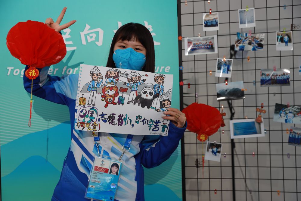志愿者杨艳楠在延庆冬奥村自拍留念(1月31日摄)。新华社发(罗敏利摄)