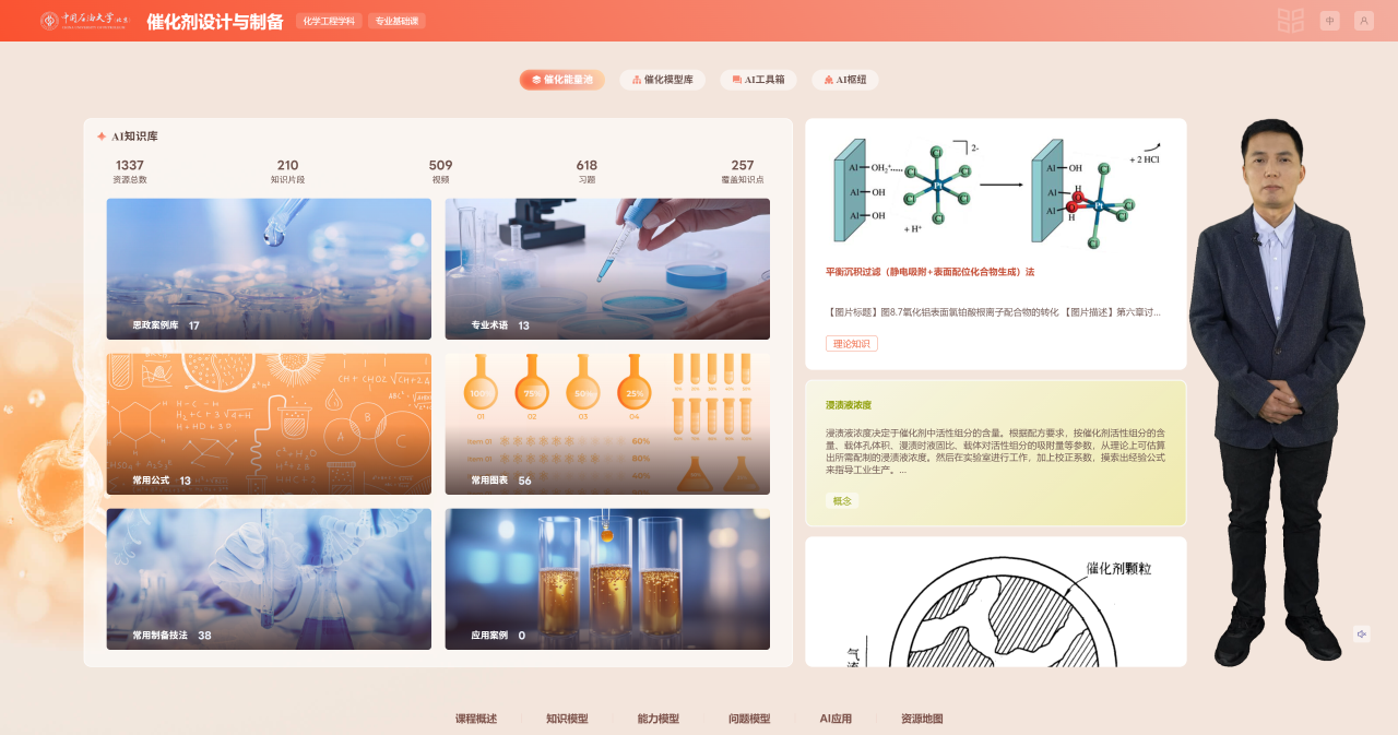 屏幕前,一位“数字人”正娓娓道来催化剂制备的奥秘,虚拟实验室里,学生大胆试错,反复推敲制备方案;知识图谱上,520多个知识点如星云般连接成网……