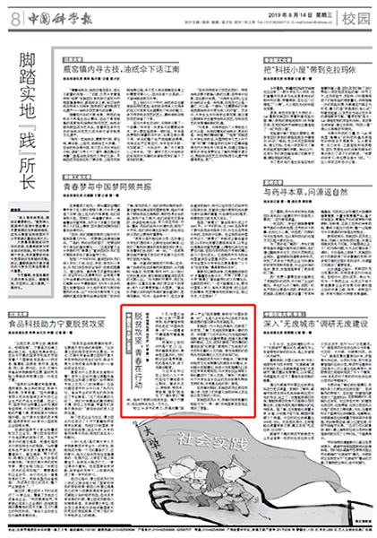 中国科学报8月14日在第八版以《脱贫攻坚,青春在行动》为题进行了报道。