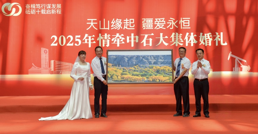 55名来自中石大附属学校的花童,身穿具有新疆特色的艾德莱斯服饰,为新人们送上克拉玛依校区准备的专属礼物——由克拉玛依市书法家协会名家崔磊挥毫题写的主题书法作品。这些珍贵墨宝,书写着对新人的殷切期望与美好祝愿。同时,银龄教师张智、赵磷慧夫妇,代表全体新人向克拉玛依校区赠送了一份特别的礼物——幽谷胡杨绘深秋,铮铮胡杨象征着中石大人扎根边疆的坚毅与薪火相传的赤诚。
