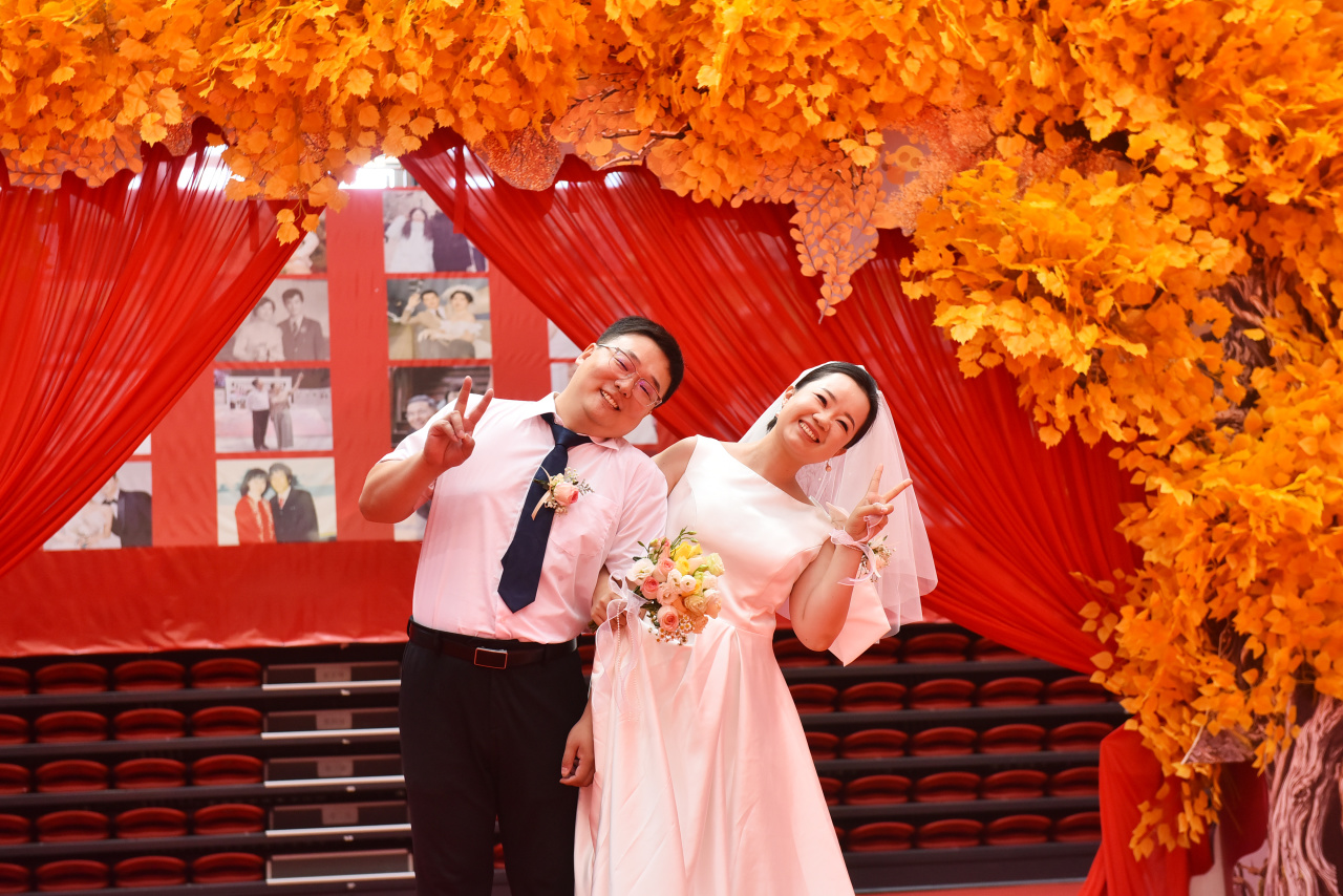 上午11点58分,体育馆鲜花簇拥,《青春舞曲》轻盈美妙,处处洋溢着幸福气息。55对新人在掌声和祝福中执手走上红毯,穿过拱门,款款步入典礼主会场。