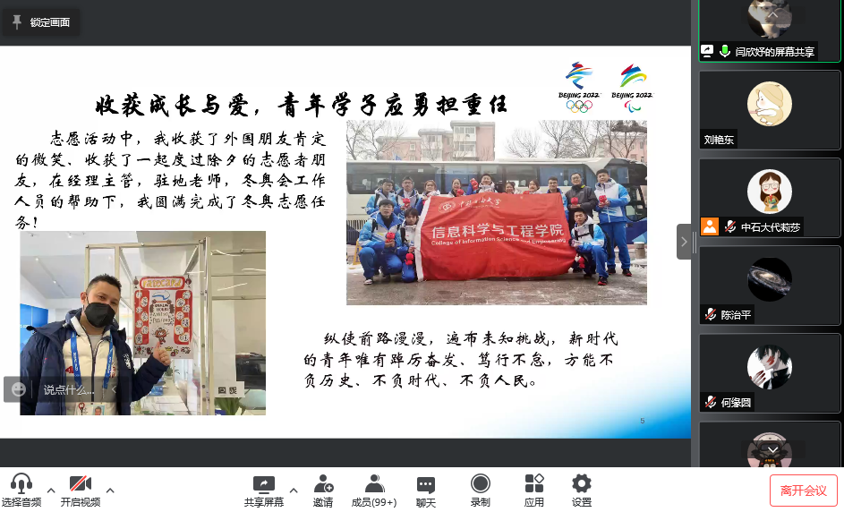 为弘扬雷锋精神,激励和引导广大学生投身志愿服务,在全国第59个学雷锋纪念日和第23个中国青年志愿者服务日到来之际,中国石油大学(北京)信息科学与工程学院举办“喜迎建团百年,共谱青春华章”主题团课。学院冬残奥会志愿者付成功,冬奥会志愿者乔佳瑜、吴一凡、陈欣妍、闫欣妤和苏星源,与学院全体团学干部和2021级本科团员相聚“云端”,畅谈志愿服务的点滴感动与团员青年的责任担当。