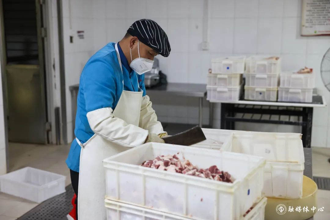 王子臣、齐宏春是第一食堂负责鲜肉加工的师傅,鸡、鸭、鱼、排骨、肉馅……每天早上不到5点就开始切肉,11月16日就切了70箱鸭腿、320斤肉。