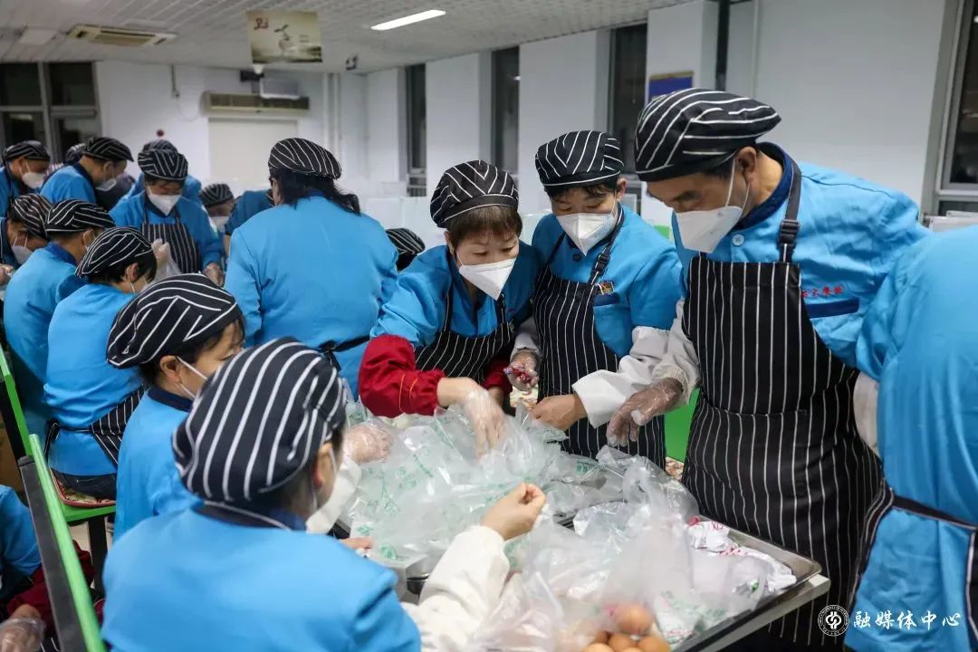 跟刘海涛一样的餐饮人员还有很多。面对巨大的供餐压力,餐饮师傅们常常通宵备餐。凌晨2点,就已起床接收原材料;凌晨3点,开始准备早餐包子的加工。天还未亮,就全员集结,开始打包早餐。灯火通明的食堂里,处处是餐饮人忙碌的身影。