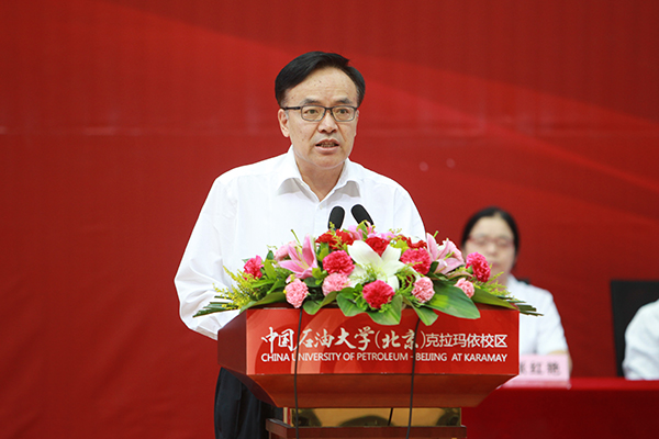 张来斌在典礼上发表讲话,对前来参加典礼的各位领导、各界嘉宾、各位家长表示衷心的感谢;对在校区起步阶段慷慨捐资、热心助学的企业表达深深谢意和敬意;对刚刚加入中国石油大学克拉玛依校区的461位新同学表示热烈祝贺和欢迎。他承诺,在克拉玛依办学既是学校的战略选择,更是一种责任和担当,相信在“一带一路”战略的引领下,在各方力量的支持和帮助下,学校一定能办出一个有特色、高水平、国际化的校区,一定能培养出高素质的优秀人才。