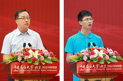 克拉玛依校区石油学院教授殷文作为教师代表发言,他说,欢迎同学们成为校区的一员,未来的几年老师们将与同学们携手前行,共同度过,希望同学们通过自己的刻苦努力,能够成长、成熟,无悔这段美好的大学时光。工学院过程装备与控制工程专业学生王煜钦作为新生代表发言,他说,中国石油大学克拉玛依校区的首届新生将以坚韧毅力面对困难,以不凡实力面对挑战,以谦虚之志面对成功,以豁达之心笑对失败。